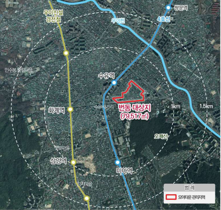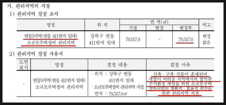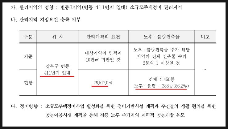 강북구 번동 411번지 일대는 79,517m²의 면적과 노후·불량건축물이 전체의 86.2%로 관리지역 지정요건에 충족이 되었습니다.