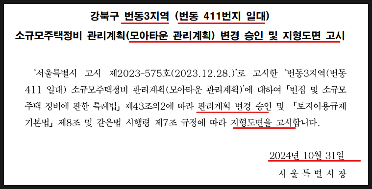 서울시는 2023년 12월 28일 고시한 강북구 번동3지역 (번동 411번지 일대) 소규모주택정비 관리계획(모아타운 관리계획)에 대하여 『빈집 및 소규모주택 정비에 관한 특례법』 에 따라 관리계획 변경 승인 및 지형도면을 고시했습니다.