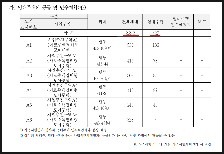 모아주택 6개소, 총세대수는 2242세대, 임대주택 427세대로 추진중입니다.