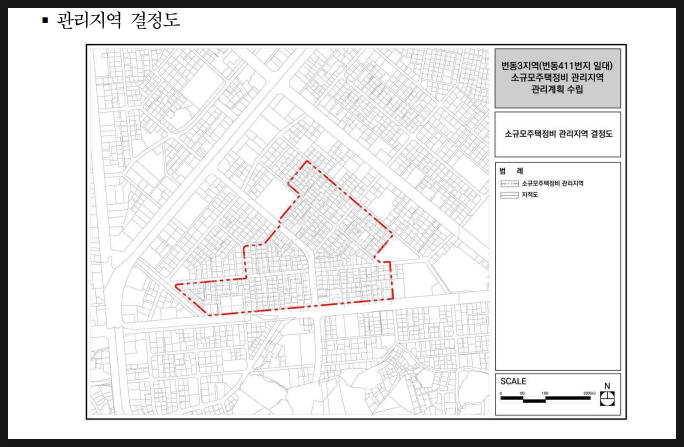 관리지역 결정 사유로는 신축과 구축 건물이 혼재되어 개발이 어려운 지역에서의 열악한 주거환경 개선을 위해 소규모주택 정비사업의 계획적·효율적 추진을 위해 관리지역으로 지정되었습니다.