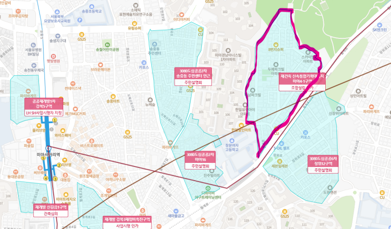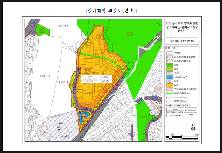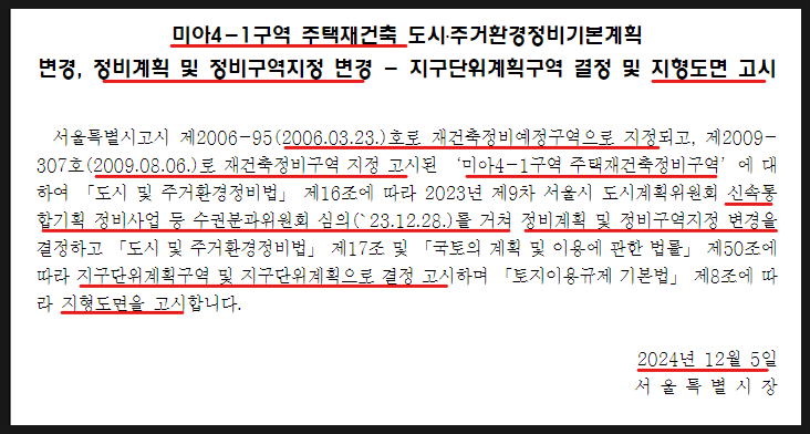 서울시는 2024년 12월 5일, 강북구 미아4-1구역(미아동 8-373번지 일대) 주택재건축 도시·주거환경정비기본계획 변경, 정비계획 및 정비구역지정 변경. 지구단위계획구역 결정 및 지형도면을 고시했습니다.