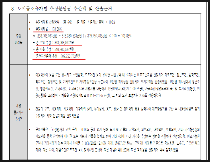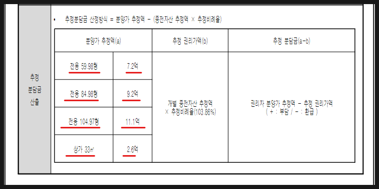 전용59m²분양가 추정액은 7.2억, 전용84m²은 9.2억, 전용104m²는 11.1억 입니다.