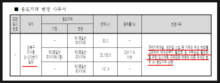 용도지역 변경사유는 주변지역개발, 경전철 신설 등 지역의 위상 변화를 고려하여 역세권부지 활성화 및 주택공급 활성화를 위한 도시계획 규제완화 적용에 따른 역세권 범위 내 용도지역이 상향되었습니다..
