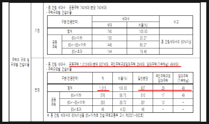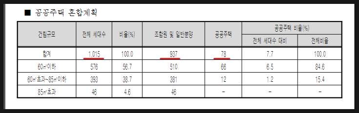 총세대수는 1015세대, 조합원 및 일반분양 937세대, 임대주택 78세대입니다. 60m²이하 비율이 56.5%이구요.