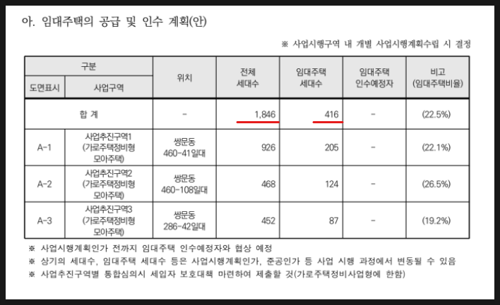 쌍문동 460번지 일대는 2개의 관리계획안이 공람 중입니다. 임대주택을 존치하느냐, 임대주택을 통합해서 사업을 진행하느냐, 주민들의 의견이 분분할 것으로 보입니다. 일치된 주민의 단합으로 성공적인 수립절차가 이루어지길 기대해 봅니다.