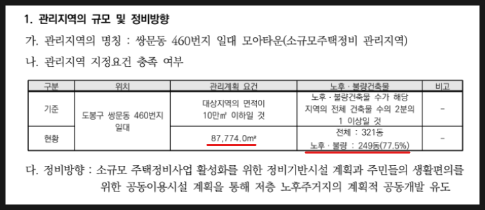 도봉구 쌍문동 460번지 일대는 모아타운 관리지역 요건인 면적 10만m²이하, 노후·불량건축물 수가 해당지역의 전체 건축물 수의 1/2 이상으로 모두 충족하는데요. 면적 87,774m², 노후·불량건축물 수는 전체의 77.5%로 모아타운 관리지역 지정요건 충족을 모두 충족합니다