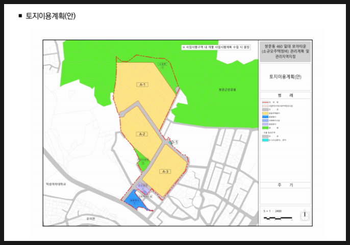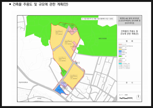금번 관리계획 주민공람은 2개의 관리계획안이 있습니다. 그것은 모아타운 구역 내에 지은 청년 매입임대주택 때문인데요. 이곳을 제외하고 사업구역을 정할 것인지, 통합하여 진행할 것인지 2개의 안입니다.