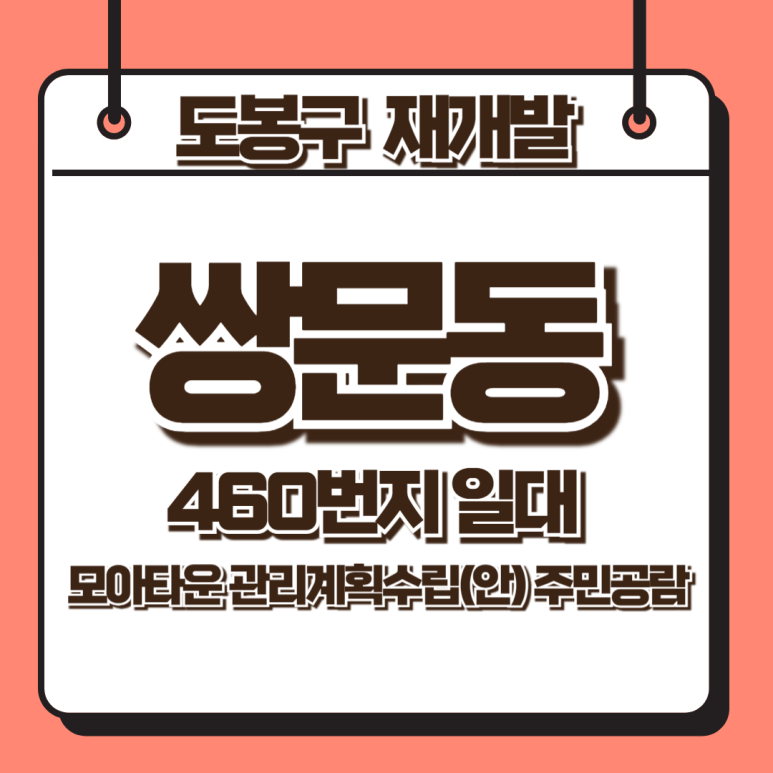 주민 공람기간은 2025. 1.8 부터 1. 22 까지 진행되는데요. 도봉구 쌍문동 460번지 일대는 2023. 9. 25일 모아타운으로 선정된 이후 관리계획 수립 절차를 진행 중입니다.