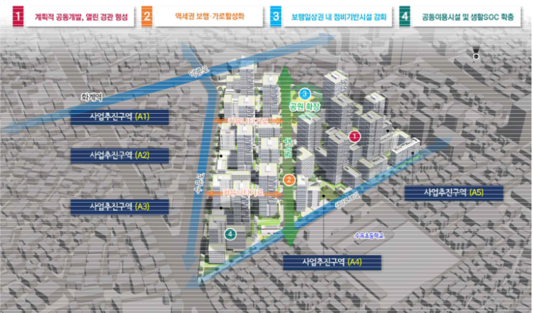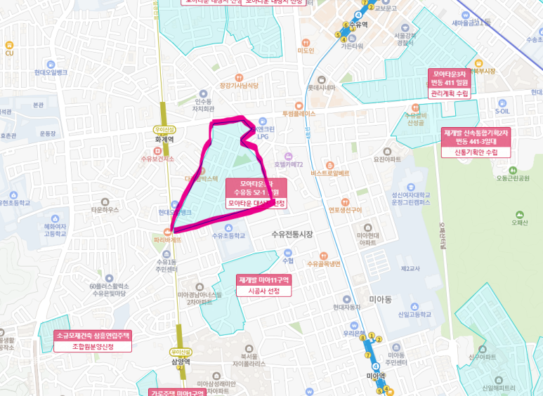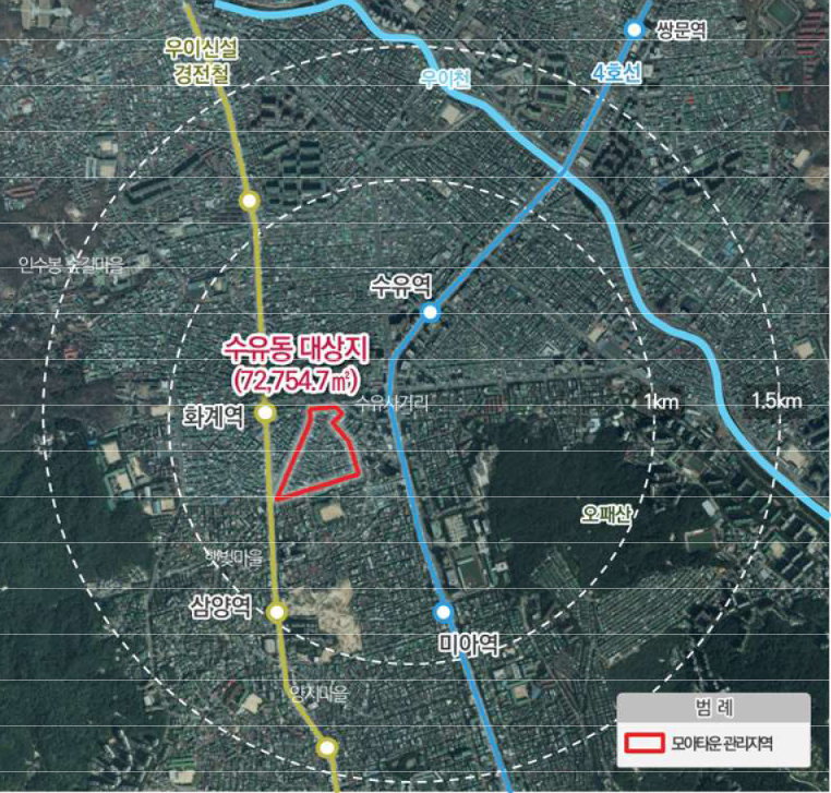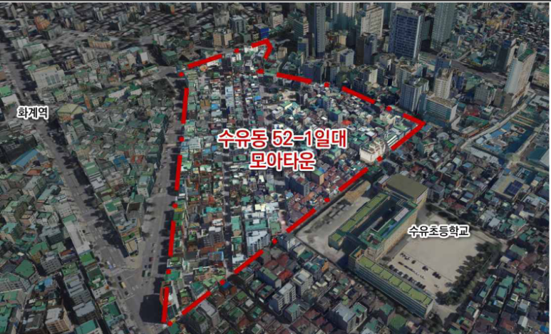 강북구 수유동 52-1번지 일대는 강북구의 중심지인 수유사거리 및 화계역(우이신설선)이 인접해 있는 곳인데요. 수유초등학교가 바로 옆에 위치하고 있어 교육 환경이 양호하지만, 신축 및 구축 건물이 혼재되어 광역적 개발이 어려운 지역입니다. 이에 모아주택 5개소로 추진, 모아주택 사업의 계획적이고 체계적인 정비 및 정비기반시설·공동이용시설의 확충 등을 통해 쾌적한 주거환경을 조성 및 지역 발전에 기여할 것으로 예상됩니다.