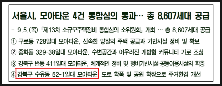 이상으로 강북구 수유동 52-1번지 일대, 모아타운 관리계획안 통합심의 통과, 모아주택 5개소 추진, 1811세대 공급에 대한 포스팅을 마치겠습니다.